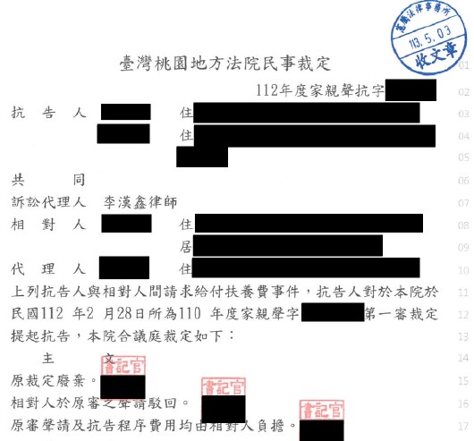對造向當事人請求給付扶養費,本所詳予調查臚列事證,以「無不能維持生活之情形」事由,成功駁回對造之聲請。