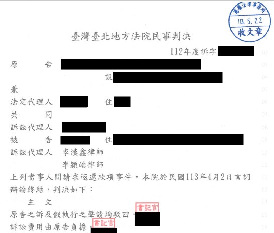 兩造前有合夥事業爭議,當事人遭對方訴請返還新臺幣兩百餘萬元,經本所爬梳事證、剖析過程,證明對方請求毫無理由,成功取得勝訴判決、駁回原告之訴。