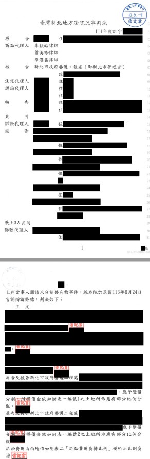 被告之一共有人為新北市政府養護工程處,援引法條並提出多則最高法院實務見解、内政部函釋等資料以力阻分割,嗣經本所向法院詳盡說明爭取後成功獲准依我方主張方式分割共有土地。(嗣據此定讞)