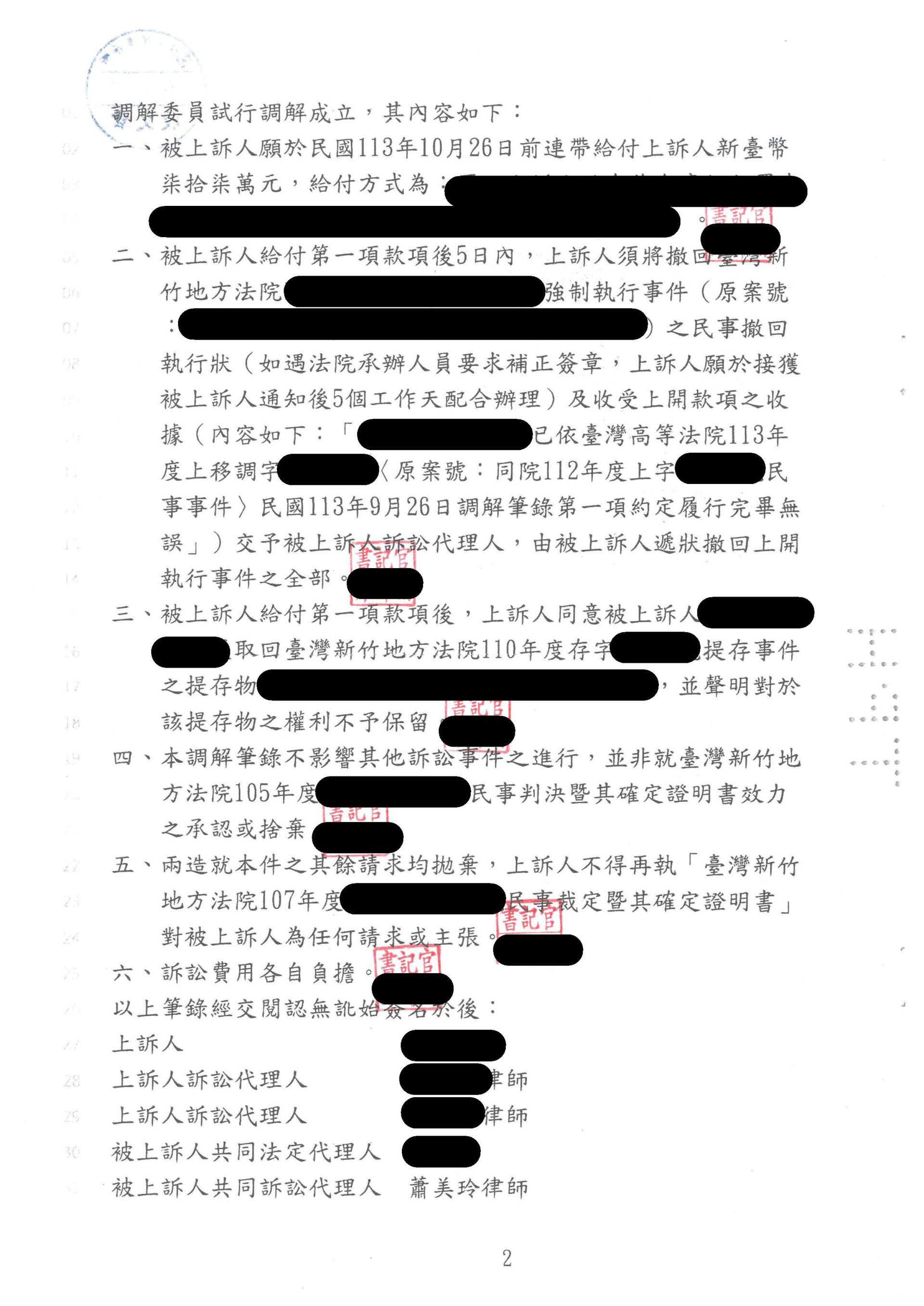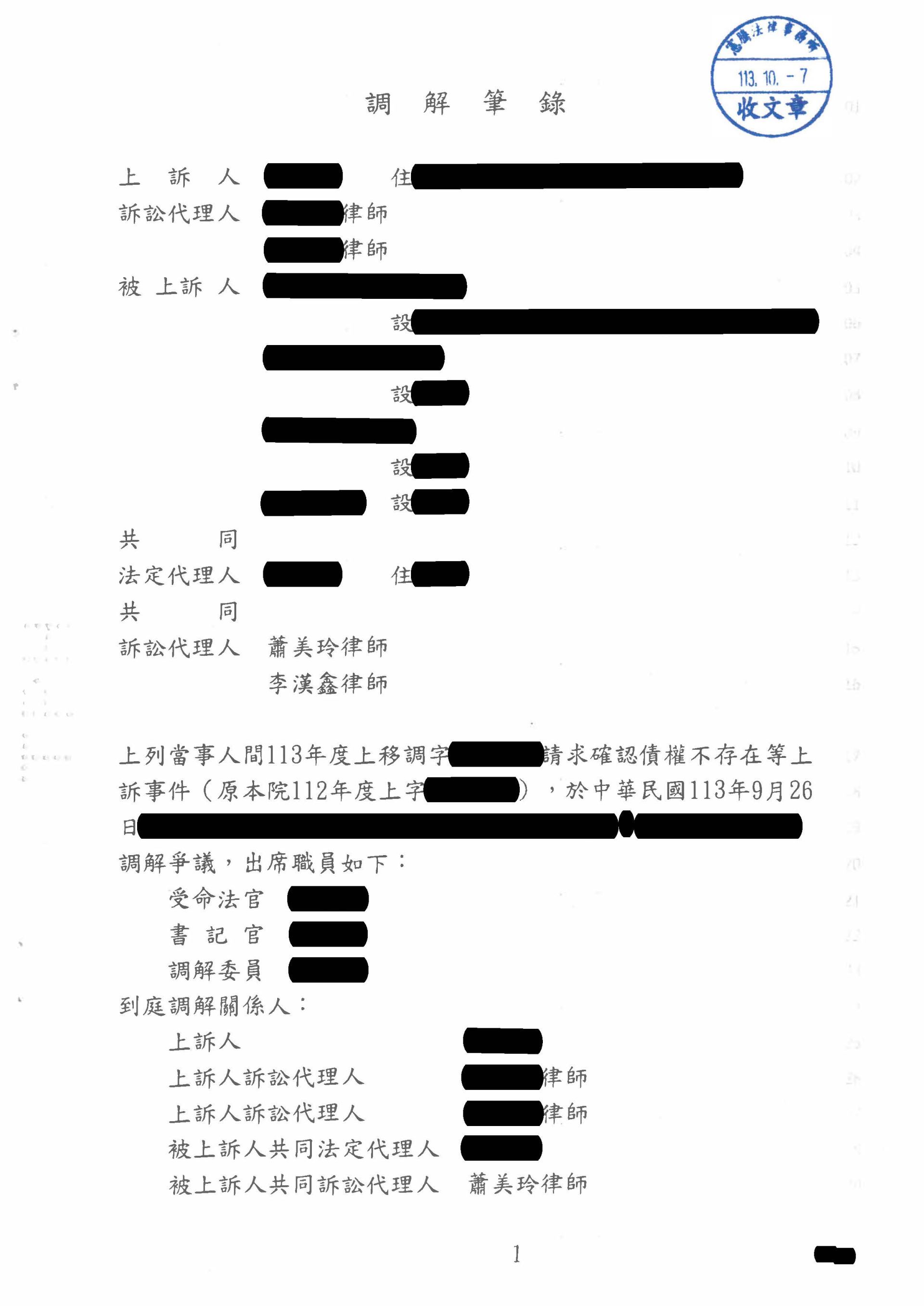 當事人遭對造執確定訴訟費用額裁定暨確定證明聲請強制執行,兩造就該裁定之效力迭有爭議,本所多方蒐羅實務見解並悉心論述攻防,成功協助當事人先行取得第一審勝訴判決,嗣於高院階段,復經多次調解,最終以「未達原裁定訴訟費用本金數額1/5」之金額調解成立,同時兼顧了當事人之程序及實體權益。