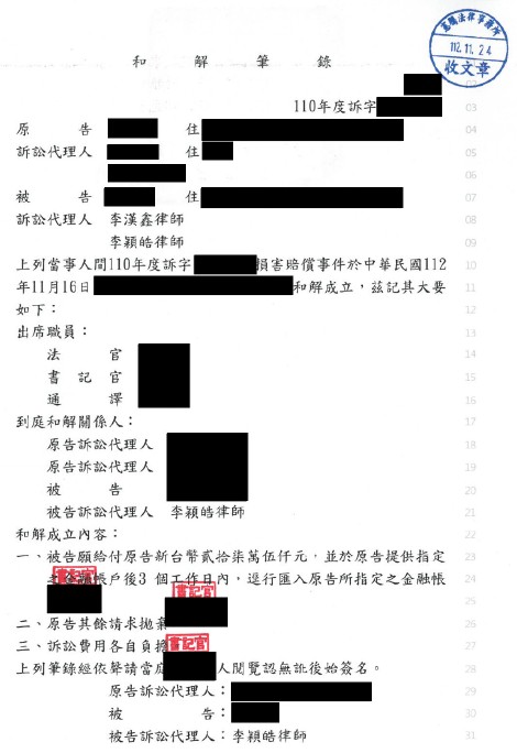 因房屋漏水遭鄰居求償逾新臺幣100萬元,經本所針對求償項目進行分析,堅守底線多方交涉後,最終以對方請求金額的1/4達成和解,直接一審定讞平息紛爭。