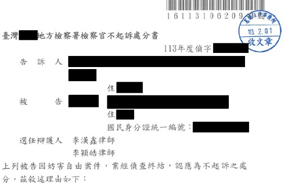 妨害自由 獲不起訴處分